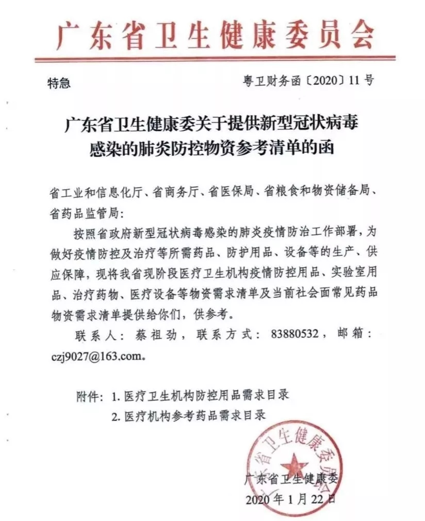 ▲廣東省衛(wèi)生健康委員會《關(guān)于提供新型冠狀病毒感染的肺炎防控物資參考清單函》