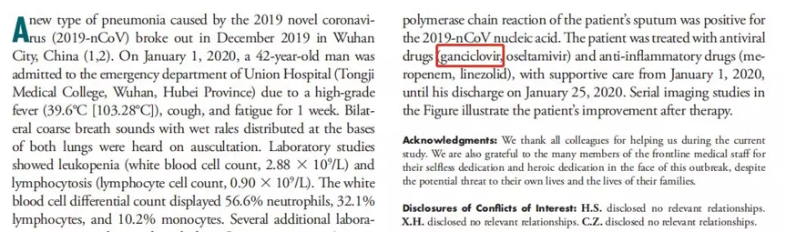 武漢同濟(jì)醫(yī)院專家在《Radiology》上發(fā)表的研究提到,142歲的患者在202011日住院,在此期間接受更昔洛韋、奧司他韋以及其他抗菌藥物治療,最終于2020125日治愈出院。